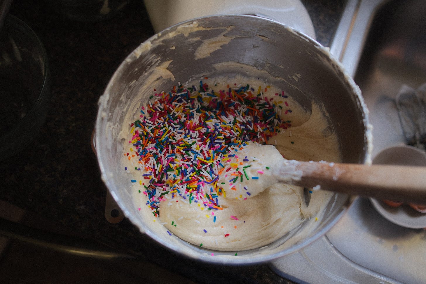 In bed I tell R that I don’t want to make my birthday cake this year. He tells me I have to, because I always have, and I tell him I haven’t always and anyways I’m feeling lonely and sorry for myself. I don’t even have a plan, or ingredients, I don’t have the desire to make myself anything. Still, the next day I go to the grocery store and buy sprinkles and heavy whipping cream and buttermilk. I find a recipe for homemade funfetti.