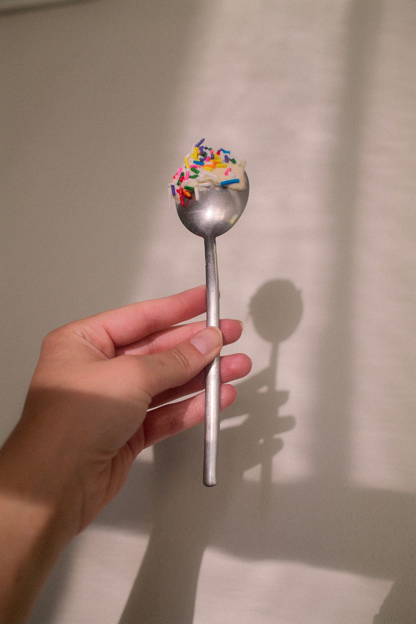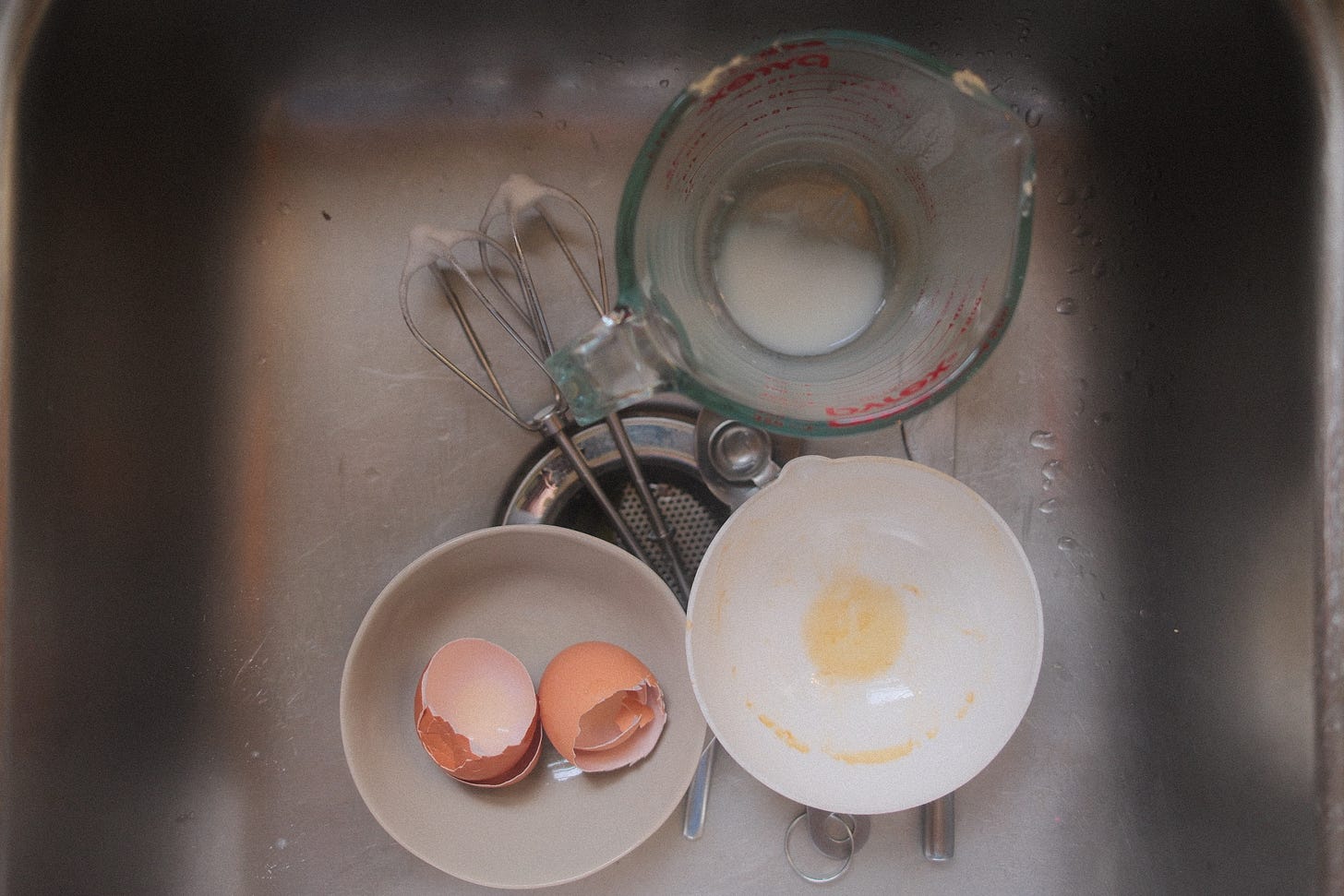 After I photograph the bowl with the sprinkles, and fold them in, after the batter is divided into two pans and the pans are put into the hot hot hot oven, I dip a spoon into the leftover batter and coat it in sprinkles. I take a photograph of the spoon. Taking pictures is like writing—once I start it’s easy to keep going. The words stacking up on the page, the shutter clicking. It’s getting started that’s the challenge. I photograph the sink with its dirty dishes, the cracked egg shell, the beaters coated in whipped egg whites. I take the bowl up to R so he can taste the batter. At the end of the night when the cakes are cool I wrap them in plastic wrap. Now that the cakes are baked, I don’t want to decorate them. In bed again, I tell R how much I don’t want to decorate them. I don’t want to spend hours on my birthday making frosting and smoothing it over the cakes and chopping strawberries to squish between the layers.