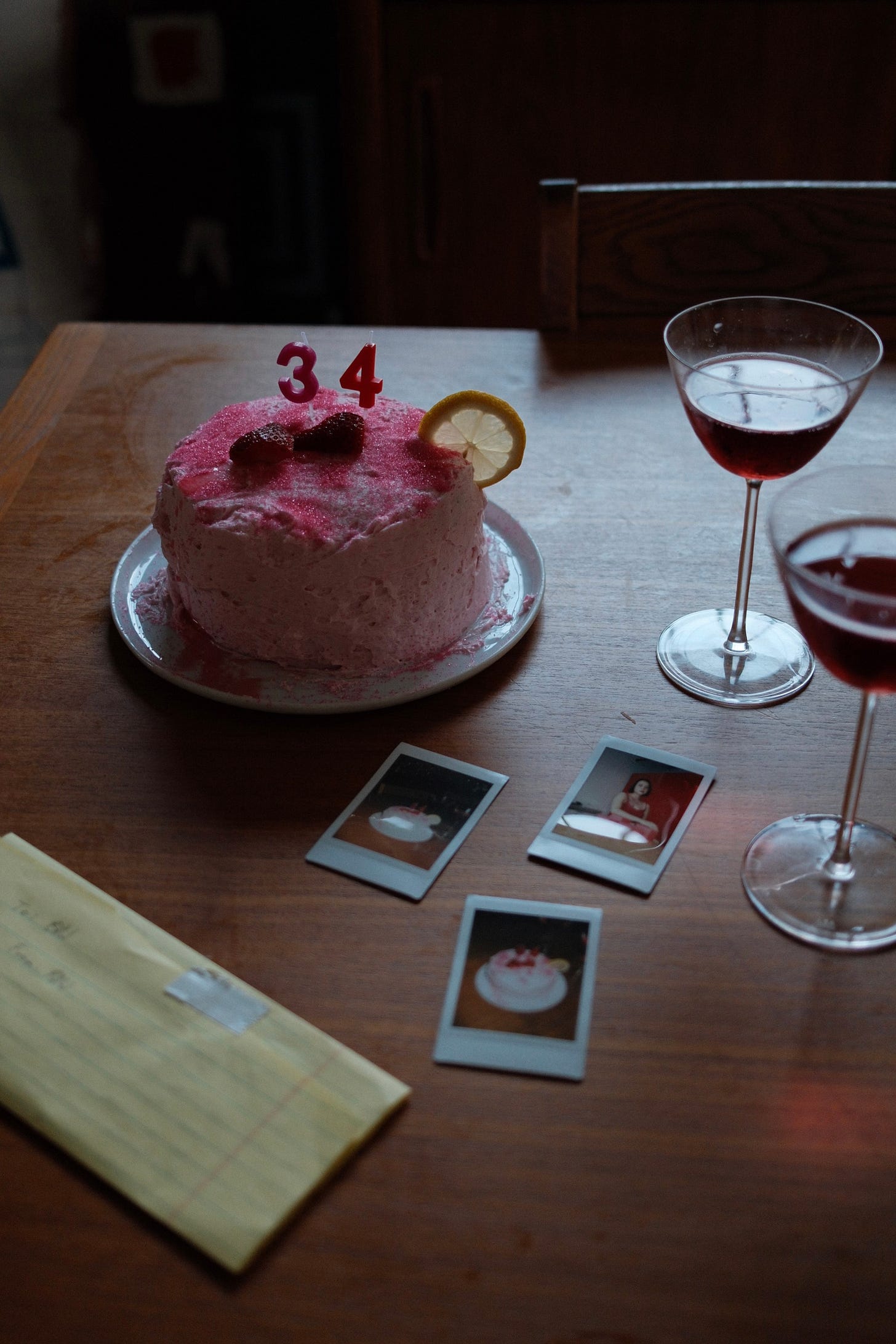 The cake tastes exactly like strawberry lemonade. I tell R this is going to be the new tradition. I’ll bake the cake layers, he’ll make frosting and decorate them. I drink another cosmo. I think, justice for cosmos! I drink too much to make up for feeling sad, which is a terrible idea, especially when you’re 34. I hate drinking too much, hate not feeling like myself, hate that I am sad on my birthday, which has on the whole not been a bad day, has in fact been a beautiful day made even more beautiful by a partner who has cared for my sensitive heart with such tenderness.